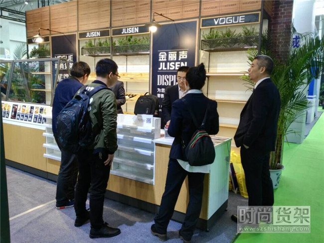 前來參觀的觀眾聚集在時尚貨架的展位內,仔細欣賞時尚貨架的每一款陳列道具。