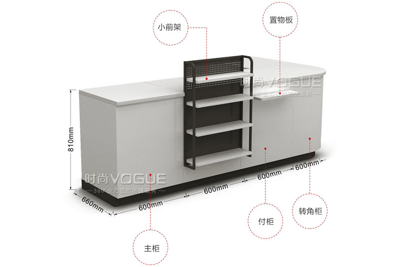 這種組合式收銀臺最大的特點就是在尺寸上可以靈活把控,收銀臺的主柜和付柜的規格均為600*600*810mm,可以以增加或減少付柜的數量來滿足各個大小規模不同的藥店使用。還可以根據店鋪需求自行選配轉角柜。