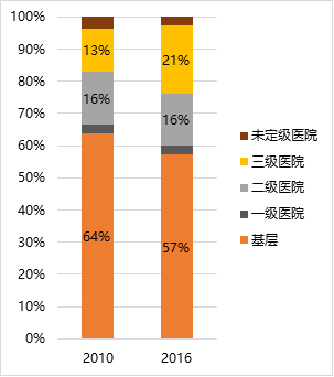 同時,基層的診療人次占總體醫院和基層診療人次的比例從2010年開始就逐漸降低,從2010占64%下降到2016年的57%,而三級醫院的占比仍保持攀升,從2010年占比13%上升到21%,二級醫院、一級醫院以及未定級醫院的占比都沒有明顯變化。