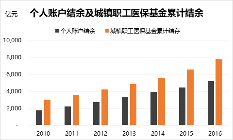 根據《2016年度人力資源和社會保障事業發展統計公報》的數據,2016年,個人賬戶結余達5200億元,而當年的城鎮職工醫保基金結余為7772億元。在2010年到2016年之間,個人賬戶結余的年平均增速為20%,城鎮職工醫保基金累計結余的年均增速為17%。