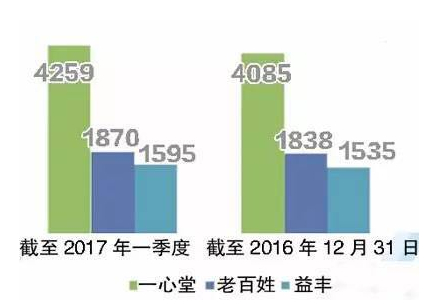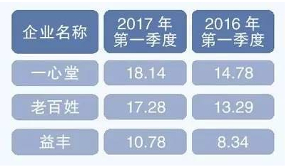 根據(jù)上圖所示的一心堂、老百姓、益豐這三大上市公司2017年一季度連鎖門店總數(shù)及連鎖營收總數(shù)計算,這三家公司旗下每家店一季度平均收入分別在45萬左右、90萬左右和68萬左右,由此可知三家公司中一年預(yù)估收益多的有360萬左右(一心堂),就算是少的也有180萬左右(益豐)。