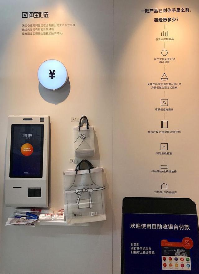 這家店也在著力突顯“智能”和“數字化”——門口有一個自動販賣機,開業第一天,附近的居民不少來排隊領取免費的購物袋。店面盡頭有一個自助結賬機器,需要打開淘寶掃描會員碼,也可以在大潤發收銀臺結賬。這家店 3 公里周邊消費者也可以在手機淘寶和大潤發優鮮 APP 上選購淘寶心選的商品,有 1 小時到家的配送服務。