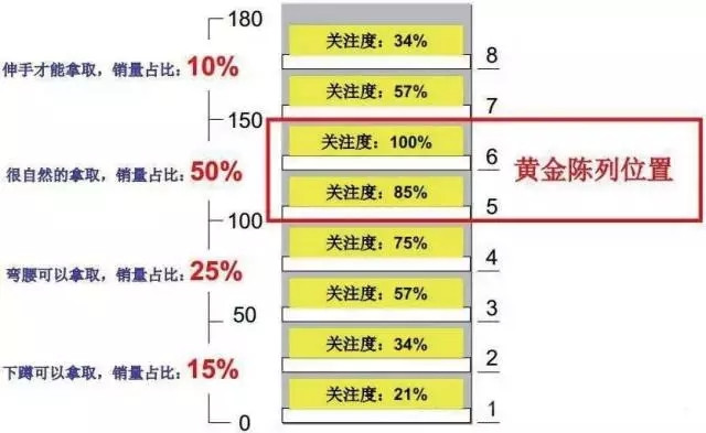 作為超市的經營者,一定要知道超市貨架的“黃金陳列位置”:亞洲人的普遍身高在160-170cm,所以顧客的視線范圍大多集中在100-150cm的范圍內,也就是貨架上第3和第4層,把人氣商品放置在這里更容易優先讓顧客發現。