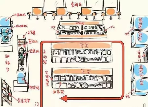 這樣擺放貨架,會(huì)自然形成一個(gè)映帶顧客向右側(cè)行走的主通道,貨架之間還留有多個(gè)副通道,非常符合人們平時(shí)的購(gòu)物習(xí)慣。